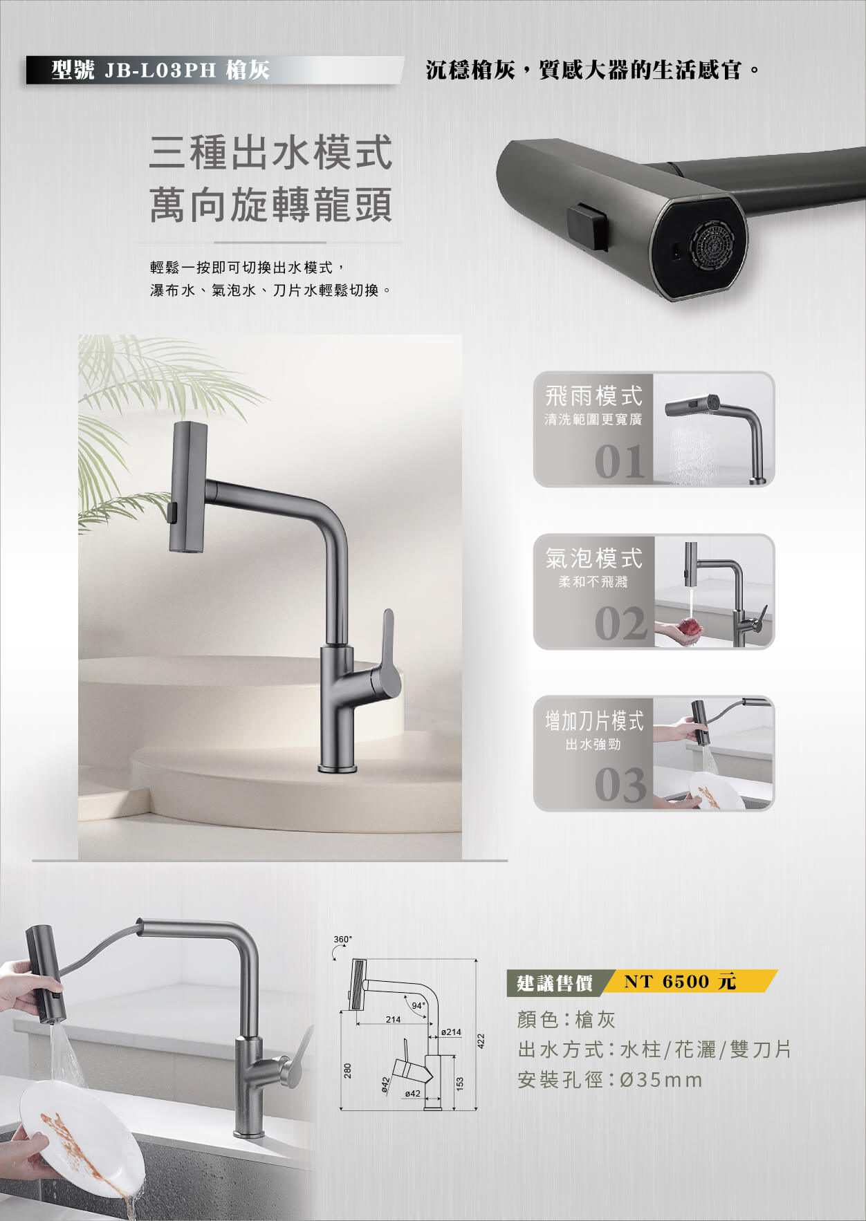 “水龍頭還是不銹鋼的好!不含鉛,才健康!” 國際上各大衛浴廠商都對與飲用水直接接觸的產品衛生安全要求有嚴格控管,在美國加州更是推出了“無鉛令”,不允許自來水與含鉛材質發生直接接觸。 表裡如一、健康環保、美觀耐用 JAMBO不銹鋼水龍頭堅持以SUS304材質精密鑄造而成,不銹鋼是國際上公認可以植入人體的健康材質。SUS304不銹鋼耐腐蝕、不生銹、不含鉛、抗氧化及水質不受污染,保障您的用水安全。JAMBO不銹鋼水龍頭主體不會對水源產生鉛污染,損害人體健康,能給我們創造一個健康廚衛的用水環境,且能符合實驗室和醫院高標準的用水要求。 由於市面上水龍頭多是由黃銅加工生產而成,容易形成銅綠,與胃酸作用易形成劇毒;黃銅材料中含有一定量的雜質重金屬(如:鉛),與水接觸後,可直接溶出到水中。尤其是水管中滯留的“隔夜水”,重金屬含量更高。鉛是常見的有毒污染物,對人體有明顯的危害。過量的鉛會損害神經、造血和生殖系統,對兒童的危害更大,可能影響兒童生長發育和智力發展。 SUS304不銹鋼耐腐蝕、不生銹、不含鉛及抗氧化等,使得JAMBO產品更加堅固耐用,大大減少重複購置,避免了資源的浪費;產品表面採用柔絲物理處理技術,擁有SUS304不銹鋼天然的銀亮色澤,物理表面處理,不需電鍍,減少了製造過程中對環境的污染,而且不必擔心電鍍層脫落或長銅銹,清潔簡單方便,可以長久呈現晶瑩透亮的外觀質感。 不銹鋼水龍頭的優點: 表裡如一: 表面和內壁材質都是SUS304不銹鋼,內壁光滑不生銹、不易納垢,不會對水源產生二次污染。柔絲表面處理,不會出現因電鍍層老化脫落而起斑點生銹的問題。 健康環保: 不銹鋼是國際公認的可以植入人體的健康材料,不含鉛,不釋放有害物質,使用更放心。產品無需電鍍,不產生電鍍廢水,減少環境污染,愛護地球家園。 美觀耐用: 不銹鋼材料抗腐蝕,不生銹,平時保養清潔更方便,使用過程中不會出現因電鍍層老化脫落影響美觀和使用壽命。