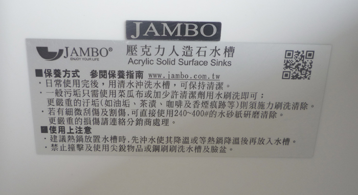 1.購入時、シンクにJAMBO logoのJAMBOシール、純正メンテナンス説明ラベル、およびシンク裏面にJAMBO logoおよび出荷シリアルナンバーがあるかを確認してください。粗悪なコピー商品の誤用を避けることで、以降のメンテナンス時に起こり得る問題を防ぎます。