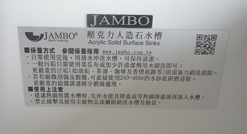 - 1. 購入時、シンクにJAMBO logoのJAMBOシール、純正メンテナンス説明ラベル、およびシンク裏面にJAMBO logoおよび出荷シリアルナンバーがあるかを確認してください。粗悪なコピー商品の誤用を避けることで、以降のメンテナンス時に起こり得る問題を防ぎます。